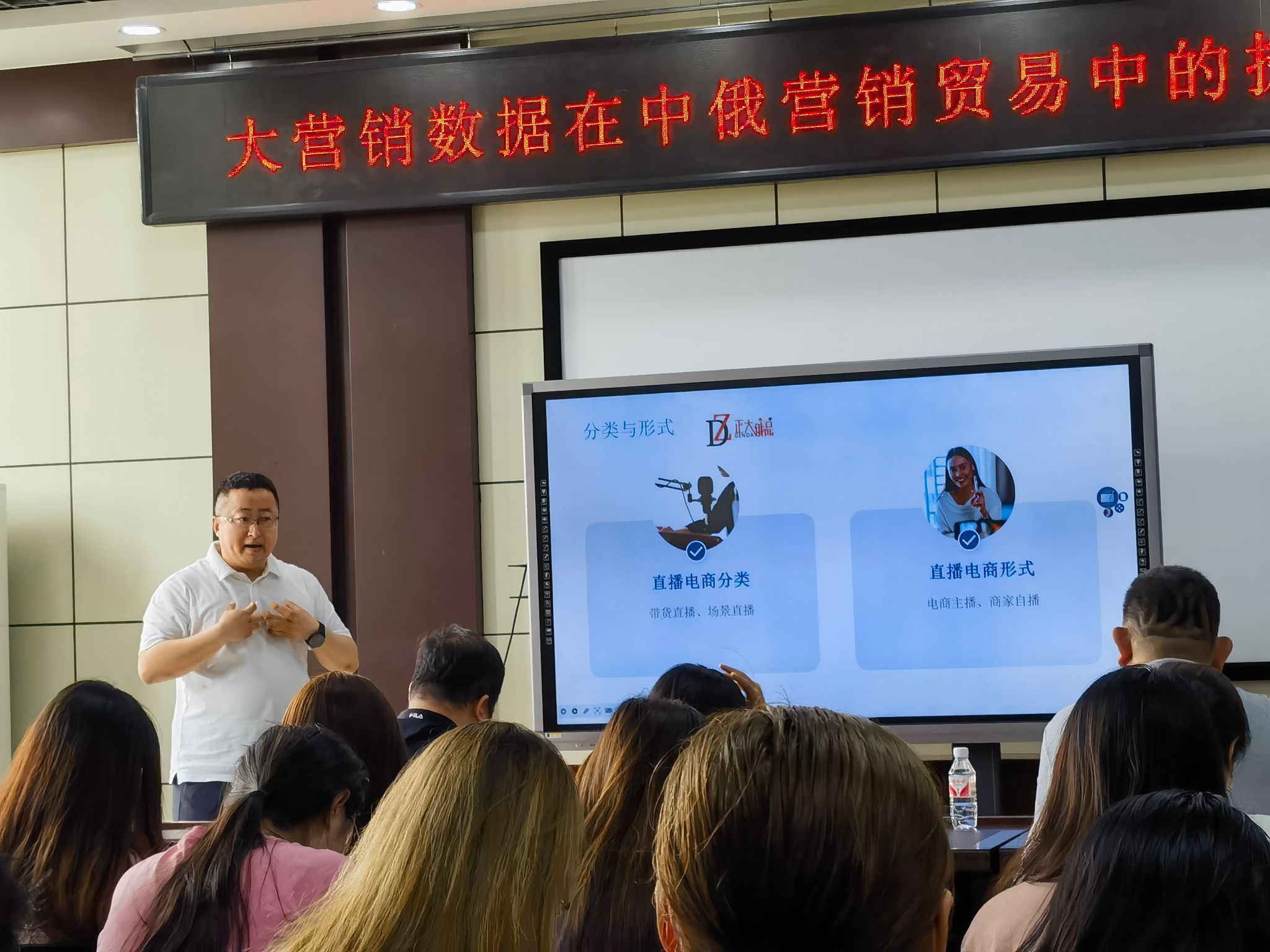 正大俄品总经理陈玉良结合实践案例介绍了直播电商的定义、发展背景及其分类形式,并详细讲解如何通过千川提升电商直播的效果,生动展现了融媒体时代大数据营销举足轻重的地位。与会师生就如何在贸易实操中应用大数据营销和中俄贸易发展等话题与嘉宾展开交流。
