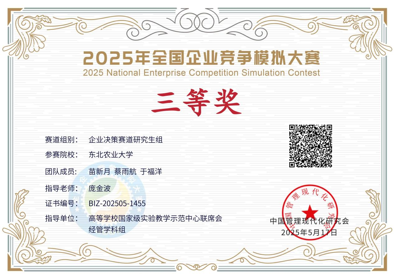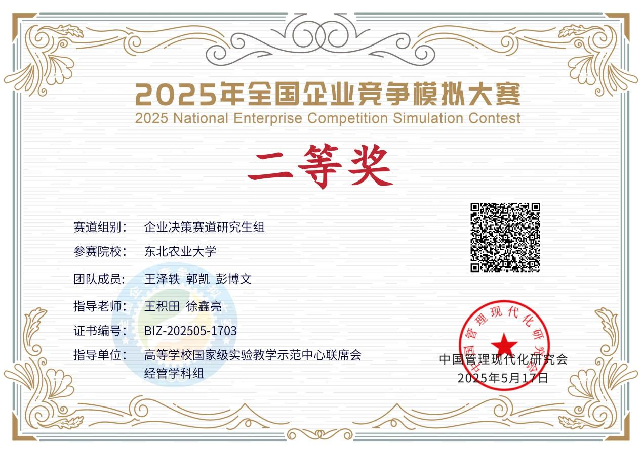 5月18日,由中国管理现代化研究会、高等学校国家级实验教学示范中心联席会经管学科组指导,中国管理现代化研究会决策模拟专业委员会主办,西南财经大学承办的2025年全国企业竞争模拟大赛总决赛在西南财经大学(柳林校区)举行,经过全国初赛、复赛、半决赛的激烈角逐,必赢76net线路两支研究生代表队脱颖而出,最终荣获全国二等奖、三等奖。