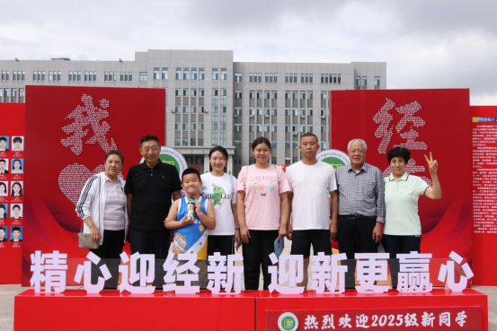 学生及家长在学院宣传板下合影