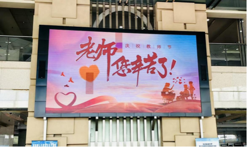 王洪亮表示教师是学校发展的核心力量,是学生成长的引路人,学院将始终把教师放在优先发展的战略位置,持续为教师搭建成长平台、解决实际困难,让教师们能够安心从教、舒心育人。与此同时,学院也致力于开展“讲述我的育人故事”微视频活动、“为教师亮灯”公益活动,并将成栋楼1楼大屏的展示内容设为“躬耕教坛,强国有我——祝全体教师教师节快乐”,并滚动播放系列暖心语句。师生纷纷驻足观看,大屏呈现的祝福语引发师生强烈情感共鸣。