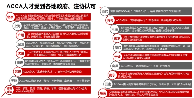 (三)ACCA会员资格在国内被广泛认可,多地政府都将ACCA持证人员列为稀缺性高端财会人才,包括上海、广州、深圳、成都、西安、厦门等在内的各大城市相继出台各项优待政策,ACCA持证人可享受积分落户、个税减免、专项奖金、置业补贴、子女入学等各项优待。