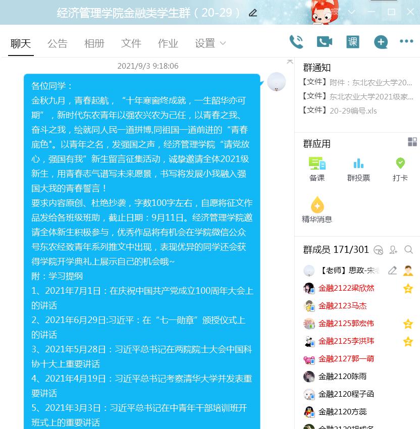 育新人、兴文化、前置入学教育。学院将2021级新生纳入“0”年级管理范畴,延伸服务时间长度、空间广度,下好先手棋。学院于入学前开展“请党放心,强国有我”新生留言征集活动,以青年之名,发强国之声,号召新生用青春志气谱写未来愿景,书写将发展小我融入强国大我的青春誓言,截止9月11日,共收取留言征文91篇。10日至12日,学院安排全天线上直播“开学第一课”,包含爱国主义影片、校史宣传片、专业介绍视频与优秀朋辈经验分享会,班级破冰交流会与游园活动,将入学教育前置,厚植学生爱国爱校情怀。