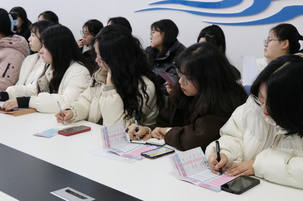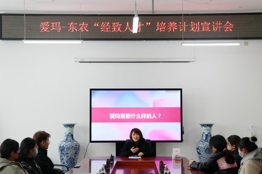 签约仪式后,“爱玛-东农经致人才”研修班宣讲会在成栋楼710室举行。金鑫面向大二、大三学生从公司的发展历程、企业产品、企业文化等方面进行了介绍,对岗位设置、薪资福利等内容进行了详细解读。通过此次"爱玛经致人才"研修宣讲会,旨在鼓励学生以院企合作发展平台为实践契机,提前了解就业市场需求,明确职业发展目标,培养综合实践能力。
