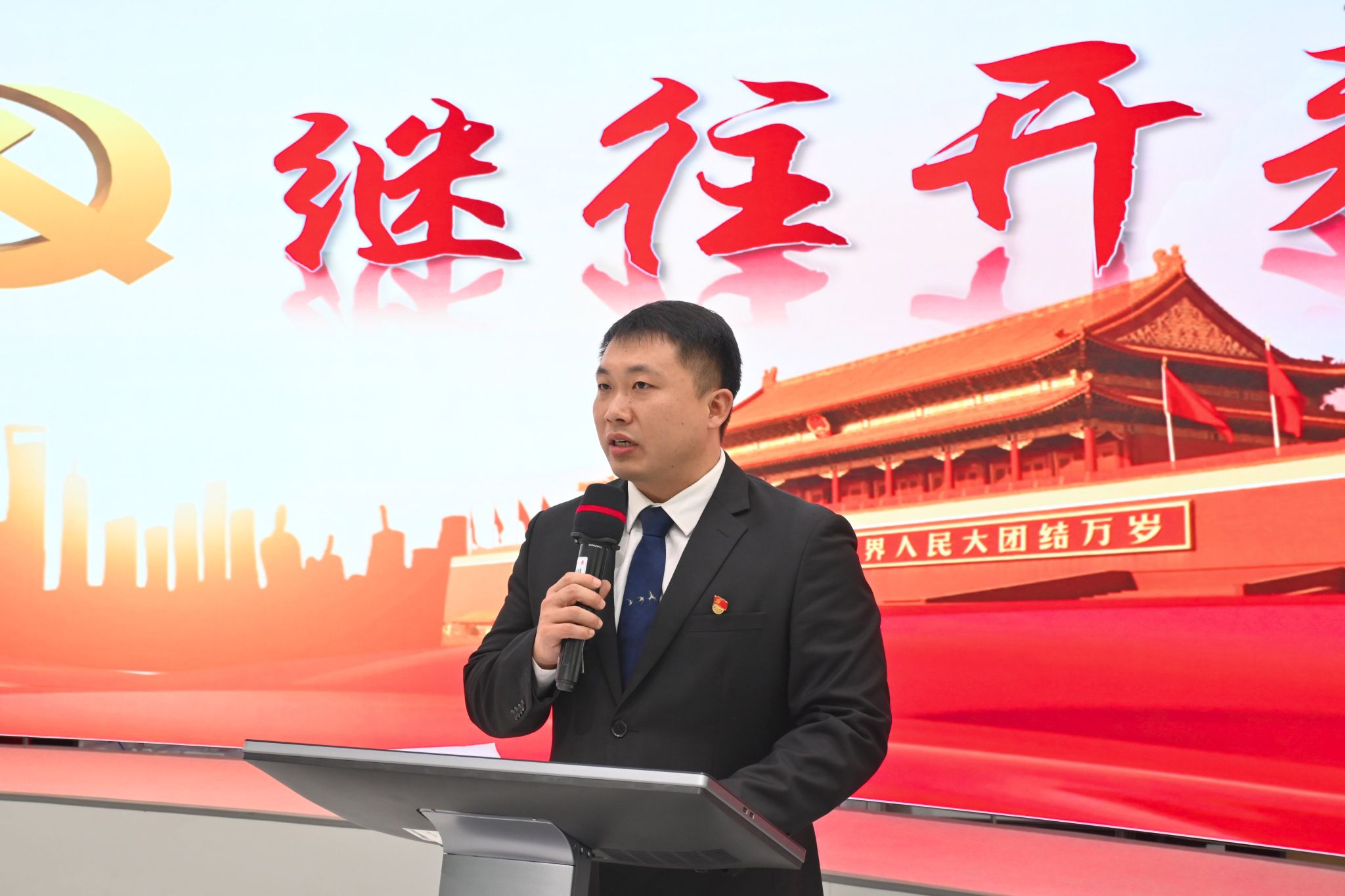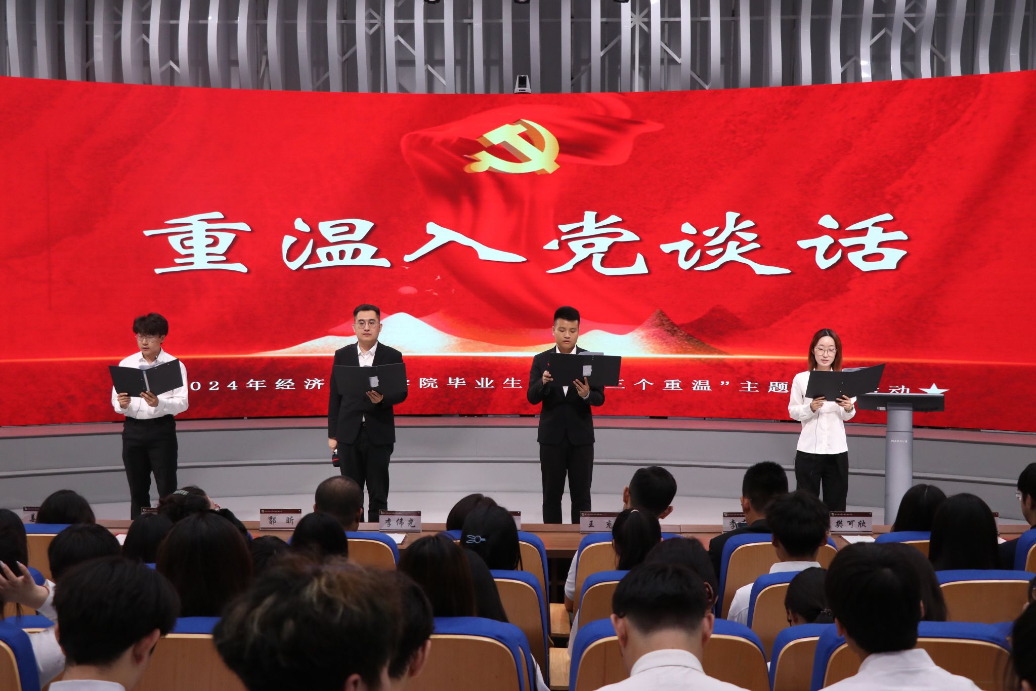 毕业班辅导员刘汉朋、肖扬与毕业生党员代表共同诵读,重温昔日入党谈话环节。老师们的教诲与期盼为学生们指明方向,学生党员们怀揣着对祖国的热爱和对人民的责任感,誓要斩破一切阻碍,披荆斩棘,为祖国的繁荣昌盛和人民的幸福安康奋斗终身。