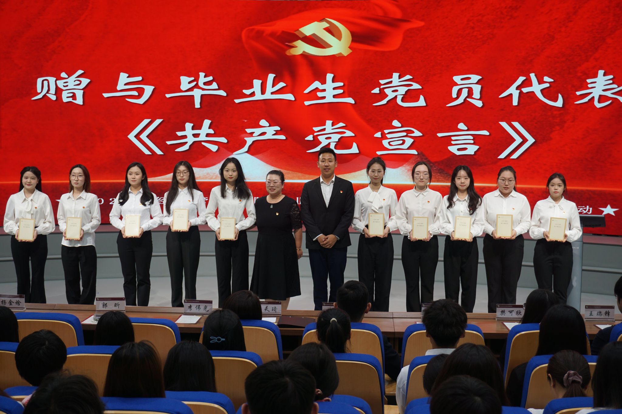 毕业年级党支部书记郭昕、李存辉将《共产党宣言》赠与毕业生党员代表。这不仅是一份厚重的礼物,更是一份沉甸甸的责任传递与殷切的期望承载。愿每一位毕业生党员都能以此为镜,始终坚守党的信仰,保持党员的先进性和纯洁性,成为新时代的坚定力量。