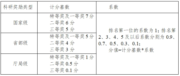 获厅局级及以上科研成果奖励证书者,按获奖等级及排名加分,合作完成的成果学校为第二单位按30%计,第三及以后按15%计。对科研获奖级别的认定参见学校职称评定文件。同一科研成果获不同级别奖项只计一个最高分。科研获奖评分标准见附表3。
