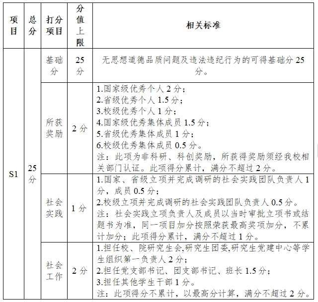 博士研究生和学术学位硕士研究生S3得分=论文(至多3篇,总分不设上限)+课题(满分10分)+获奖(满分6分)+批示与著作(满分4分)+会议(满分10分)+大赛(满分10分)——最高65分
