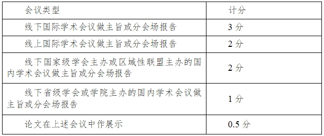 二是学生参加本学科领域国际学术会议(三国及以上)或国内学术会议并在大会做主旨报告或分会场报告者予以加分。不同论文在不同会议发言可累计加分。同一论文在不同会议发言只计一次最高分。论文没有被邀请作报告但是被邀请作展示加0.5分(同一篇论文不累计)。学生须提供会议手册及参会证明(照片、录音、录像等,任选其一)。评分标准见附表6。