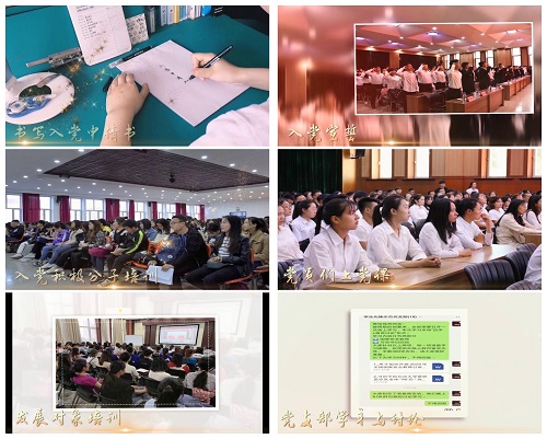 在重温入党誓词环节,全体参会人员一同观看视频《我宣誓》,回顾了中国共产党走过的艰辛而光荣的岁月。随后,参会人员全体起立,面向党旗,举起右拳,由辅导员代表王功臣领誓,重温了入党誓词。